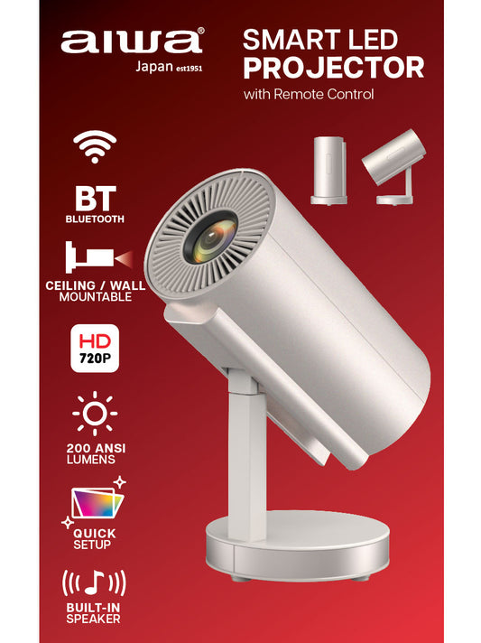 AIWA SMART LED PROJECTOR (AWH09-CHAMP) Ceiling, Wall, Desk Mount, 720p HD Display, Bluetooth Connectivity, Remote Control Included