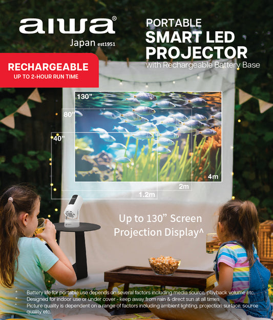 Experience smart projection on the go with AIWA’s rechargeable LCD projector. Up to 160" screen...