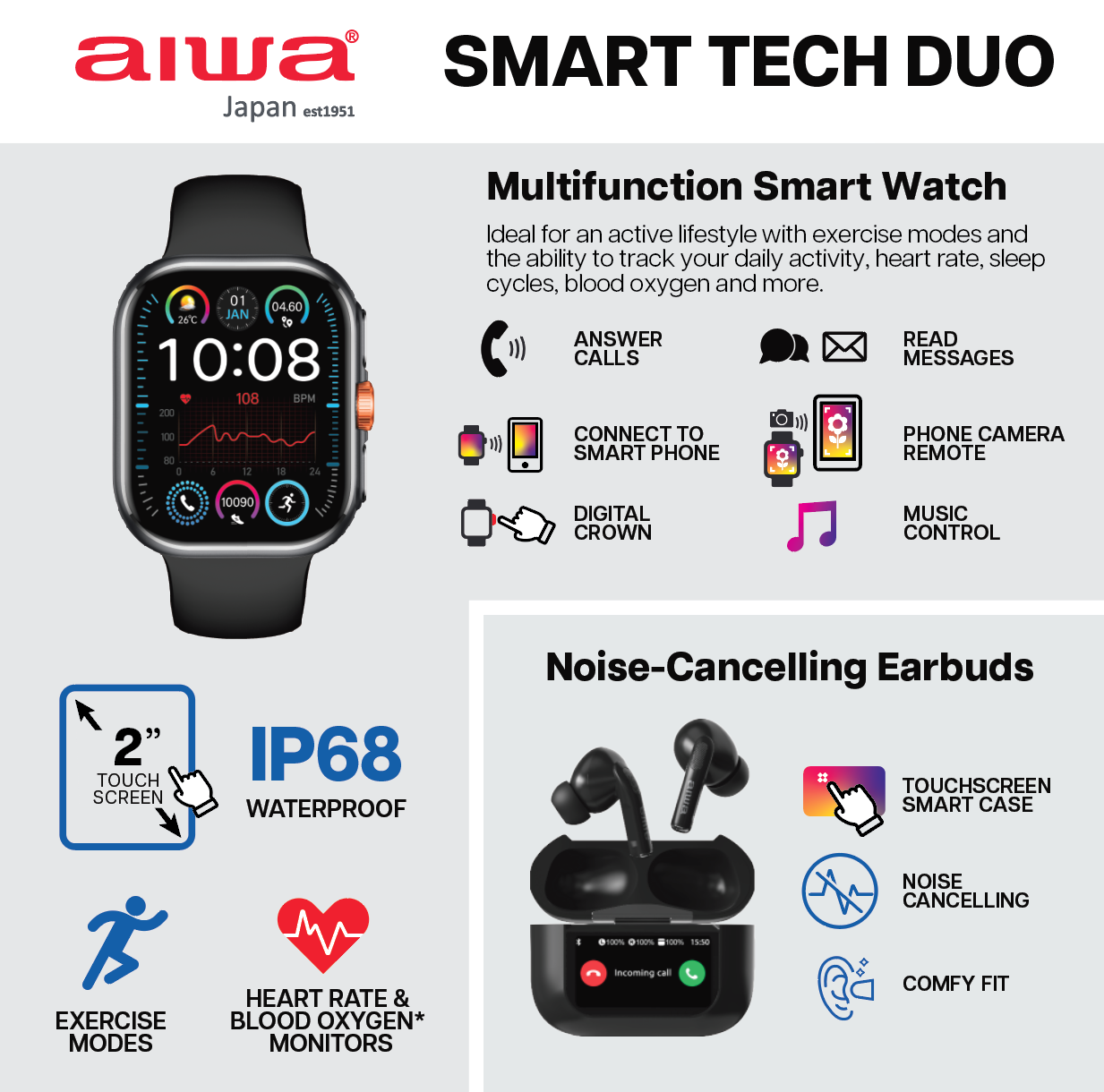 Upgrade your active lifestyle with AIWA’s Smart Tech Duo. This waterproof smartwatch and wireless earbuds combo offers message sync, fitness tracking, and immersive sound for on-the-go performance.